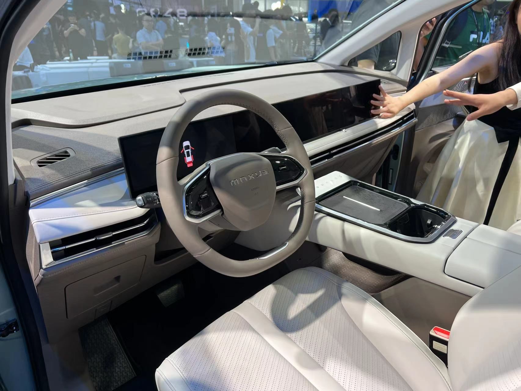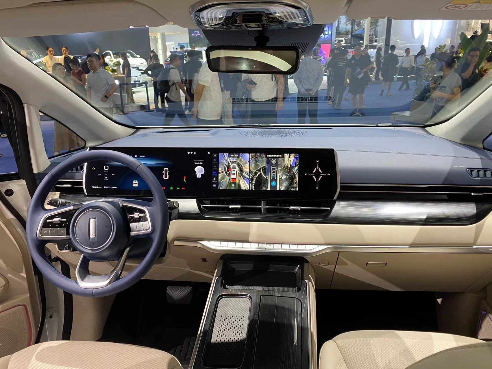 進入車內,最引人矚目的便是由三塊12.3英寸屏組成的聯(lián)屏系統(tǒng),并內置高通驍龍8155芯片斑馬智行系統(tǒng)。主副駕車門上還配備了電子后視鏡(選裝件)的車內顯示屏,座艙的科技感濃重。整個內飾風格素雅簡約,中控臺和中央通道區(qū)域使用了大面積皮質包覆,質感豪華。