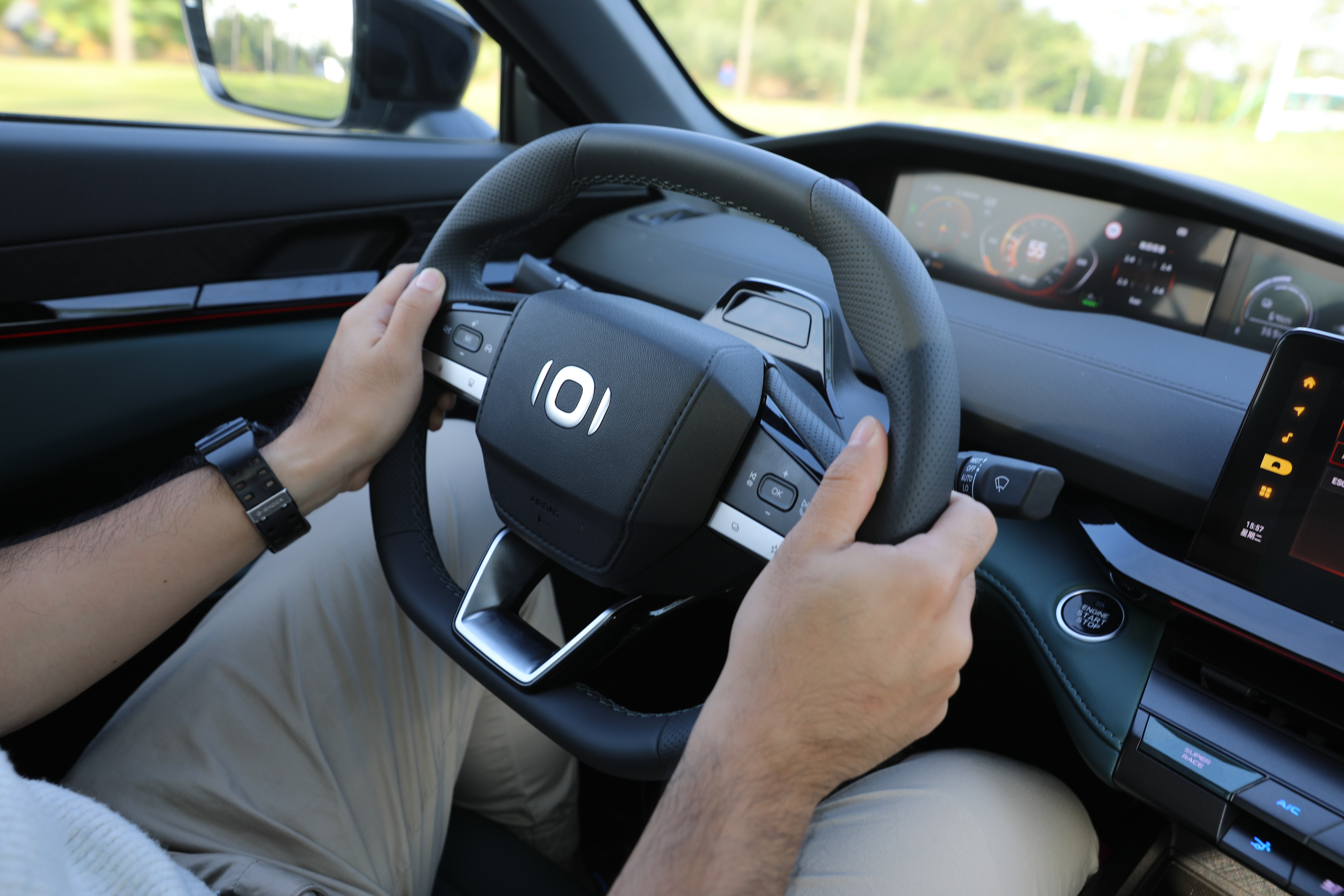智能驅(qū)動(dòng)模式能夠幫助車輛在不同電量狀態(tài)下,以最優(yōu)的驅(qū)動(dòng)結(jié)構(gòu)對動(dòng)力進(jìn)行分配,而當(dāng)筆者啟動(dòng)SUPER RACE模式,首先映入眼簾的是儀表盤、中控屏切換到更激進(jìn)的界面UI,其次,車輛的動(dòng)力進(jìn)入到嚴(yán)陣以待的狀態(tài),油門響應(yīng)更為積極,配合模擬聲浪,整車的運(yùn)動(dòng)氣質(zhì)完全展現(xiàn)出來。