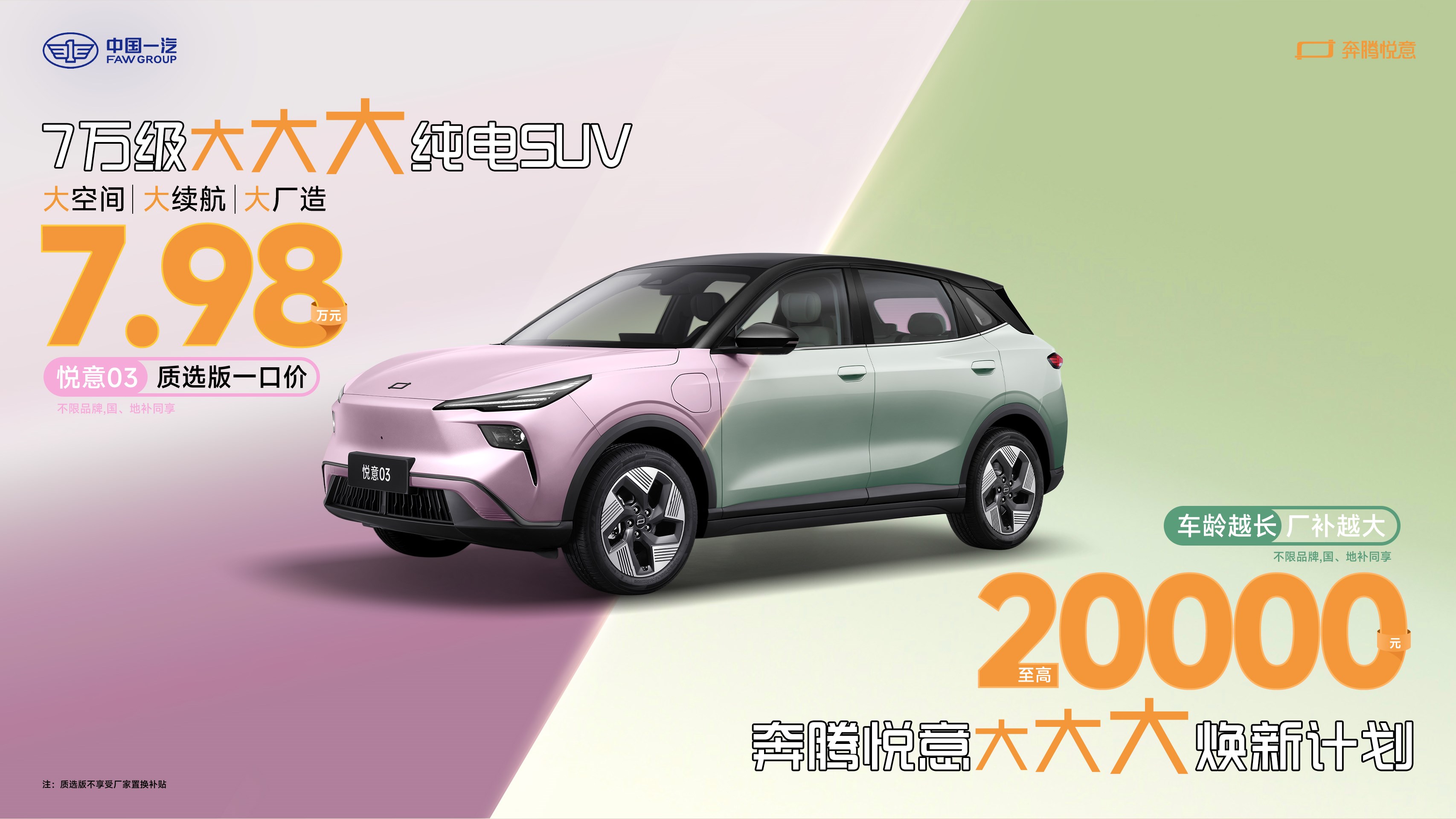令人驚喜的是,剛剛上市的悅意03,即日起重磅加推全新版型“質(zhì)選版”,一口價僅售7.98萬元,原有車型的煥新廠補(bǔ)還將拉高至最高20000元,同時還可同享國、地補(bǔ),堪稱A級SUV質(zhì)價比新卷王。再加持大空間、大續(xù)航和大廠造三大越級亮點(diǎn),悅意03這一“7萬級大大大純電SUV”,必將成為奔騰悅意展臺的又一亮點(diǎn)。
