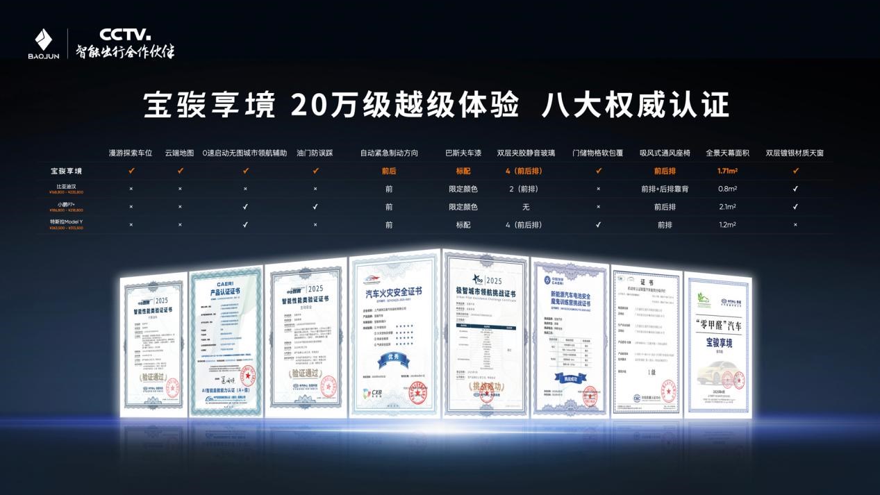 寶駿享境越級(jí)實(shí)力斬獲中國汽研、中汽中心八大權(quán)威認(rèn)證,涵蓋安全、智能、能效等核心產(chǎn)品力,以硬核實(shí)力成為C級(jí)大家轎里的全能選手、用戶的智能出行好伙伴。