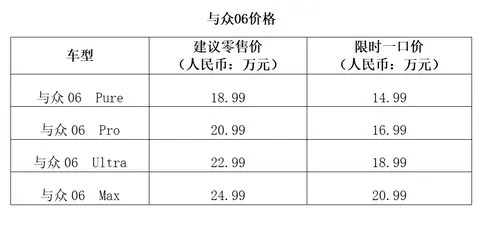 Pure與Pro、Ultra、Max共同組成了與眾06的多元化版本選擇,可以滿(mǎn)足不同用戶(hù)的多場(chǎng)景用車(chē)需求。用戶(hù)可根據(jù)自身預(yù)算與使用習(xí)慣靈活選擇,在確保核心體驗(yàn)的同時(shí),兼享合理配置與優(yōu)質(zhì)價(jià)值。